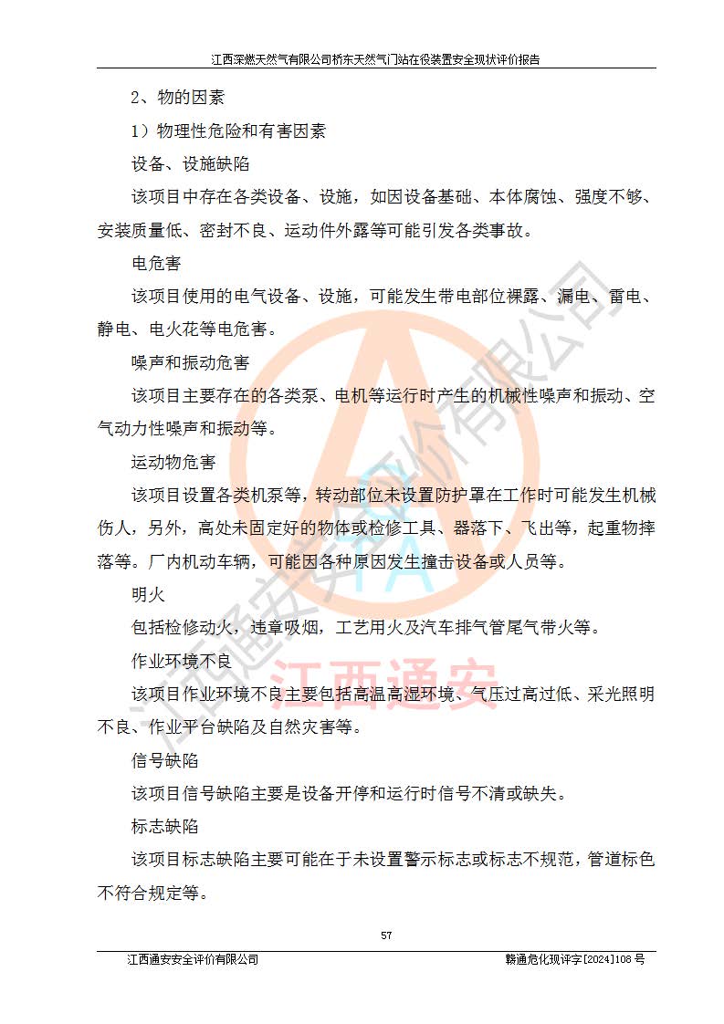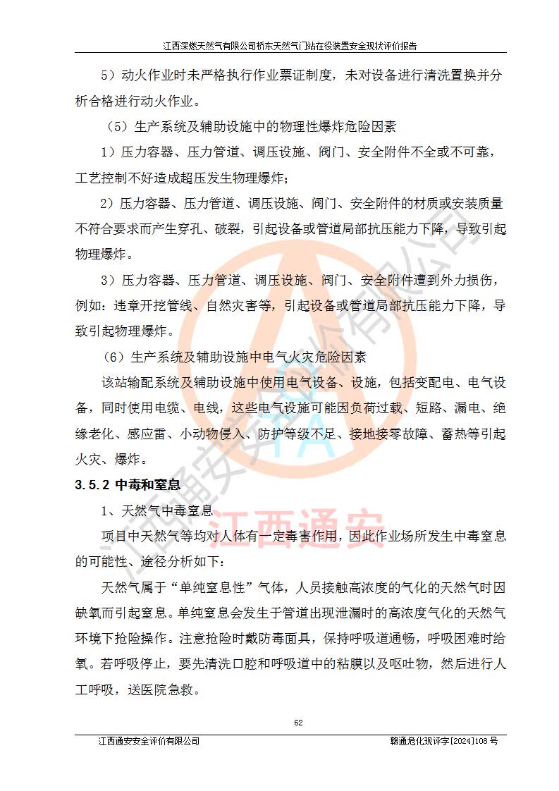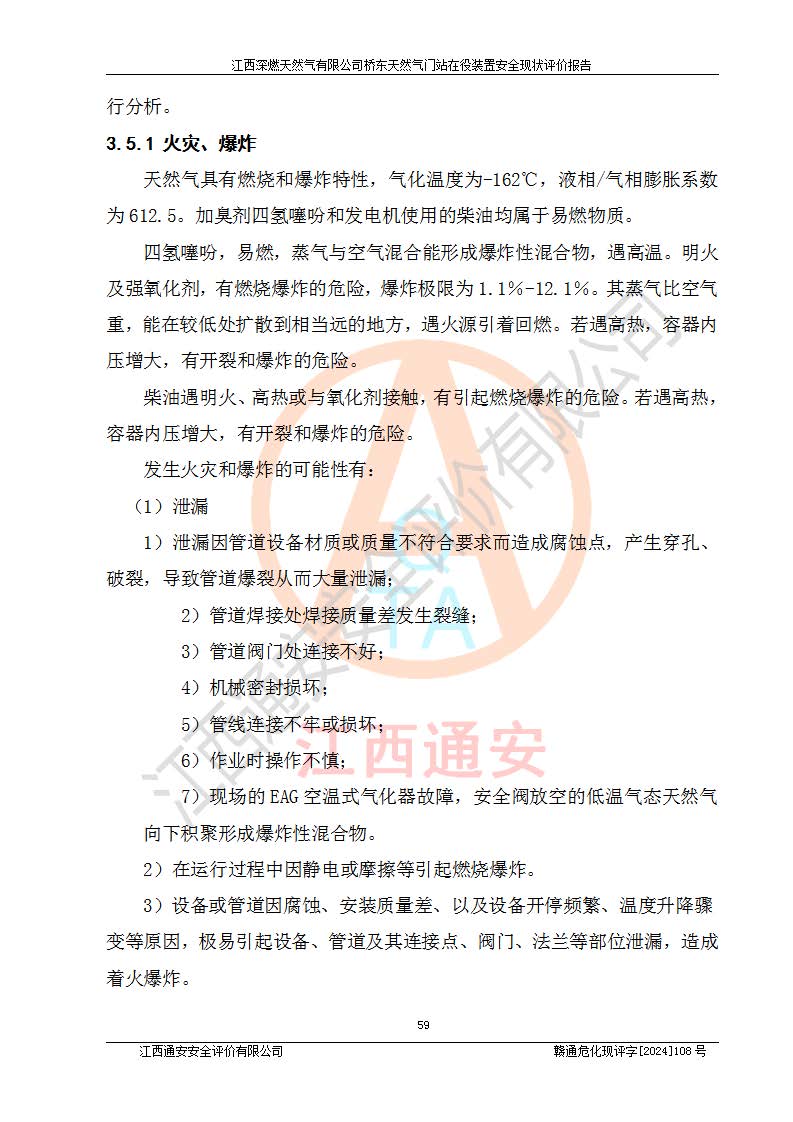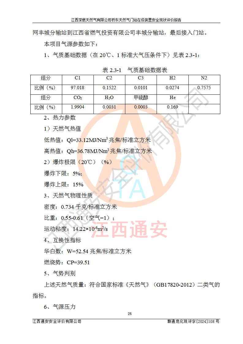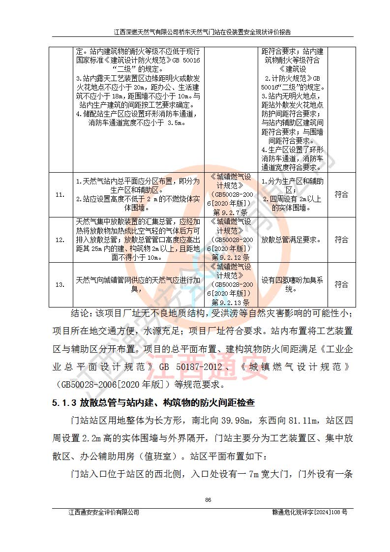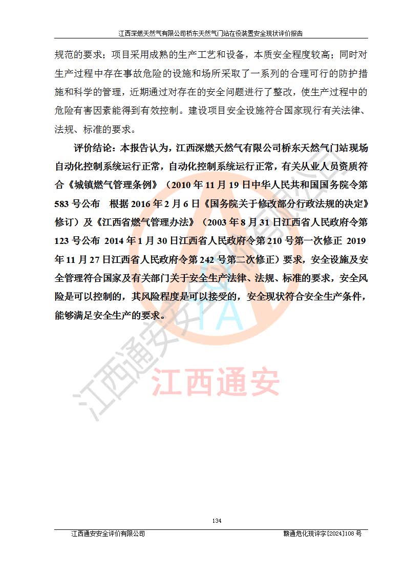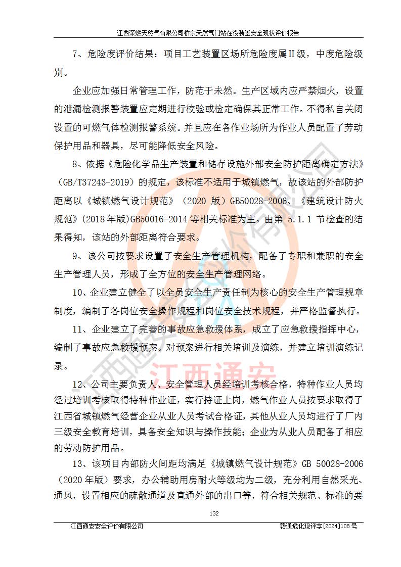 其它 | 1、依據(jù)相關(guān)法律、法規(guī)、標(biāo)準(zhǔn)等的規(guī)定,該項(xiàng)目周邊環(huán)境、總平面布置、建筑結(jié)構(gòu)、工藝及設(shè)備、防火防爆安全設(shè)施、有毒有害因素控制等符合**相關(guān)標(biāo)準(zhǔn)規(guī)范的要求,能滿(mǎn)足安全生產(chǎn)的要求。 2、該項(xiàng)目涉及的危險(xiǎn)化學(xué)品有:天然氣、四氫噻吩、柴油,其中天然氣屬于重點(diǎn)監(jiān)管的危險(xiǎn)化學(xué)品,不涉及特別管控危險(xiǎn)化學(xué)品。 3、該項(xiàng)目在生產(chǎn)過(guò)程中存在的主要危險(xiǎn)有:火災(zāi)爆炸、中毒窒息、容器爆炸、觸電傷害、機(jī)械傷害、高處墜落、**傷害、灼燙等。其中火災(zāi)爆炸、中毒窒息、容器爆炸是*主要的危險(xiǎn)因素。 4、該項(xiàng)目生產(chǎn)單元和儲(chǔ)存設(shè)施單元不構(gòu)成危險(xiǎn)化學(xué)品重大危險(xiǎn)源。 5、根據(jù)《**安全監(jiān)管總局關(guān)于公布首批重點(diǎn)監(jiān)管的危險(xiǎn)化工工藝目錄的通知》(安監(jiān)總管三〔2009〕116號(hào))和《**安全監(jiān)管總局關(guān)于公布第二批重點(diǎn)監(jiān)管危險(xiǎn)化工工藝目錄和調(diào)整首批重點(diǎn)監(jiān)管危險(xiǎn)化工工藝中部分典型工藝的通知》(安監(jiān)總管三〔2013〕3號(hào))進(jìn)行危險(xiǎn)工藝辨識(shí):該項(xiàng)目不涉及重點(diǎn)監(jiān)管的危險(xiǎn)化工工藝。 6、作業(yè)條件危險(xiǎn)性分析評(píng)價(jià)結(jié)果:該項(xiàng)目的作業(yè)條件相對(duì)比較安全。在選定的2個(gè)單元中13個(gè)小項(xiàng)目里,可能出現(xiàn)“顯著危險(xiǎn)”有1個(gè)項(xiàng)目,且顯著危險(xiǎn)項(xiàng)目的出現(xiàn)均由物料的危險(xiǎn)程度所決定,而“一般危險(xiǎn)”有8個(gè)項(xiàng)目,其余項(xiàng)目均在“稍有危險(xiǎn)”范圍,作業(yè)條件相對(duì)安全。 7、危險(xiǎn)度評(píng)價(jià)結(jié)果:項(xiàng)目工藝裝置區(qū)場(chǎng)所危險(xiǎn)度屬Ⅱ級(jí),中度危險(xiǎn)級(jí)別。 企業(yè)應(yīng)加強(qiáng)日常管理工作,防范于未然。生產(chǎn)區(qū)域內(nèi)應(yīng)嚴(yán)禁煙火,設(shè)置的泄漏檢測(cè)報(bào)警裝置應(yīng)定期進(jìn)行校驗(yàn)或檢定保障其正常工作。不得私自關(guān)閉設(shè)置的可燃?xì)怏w檢測(cè)報(bào)警系統(tǒng)。并且應(yīng)在各作業(yè)場(chǎng)所為作業(yè)人員配置了勞動(dòng)保護(hù)用品和器具,盡可能降低安全風(fēng)險(xiǎn)。 評(píng)價(jià)結(jié)論:本報(bào)告認(rèn)為,江西深燃天然氣有限公司橋東天然氣門(mén)站現(xiàn)場(chǎng)自動(dòng)化控制系統(tǒng)運(yùn)行正常,自動(dòng)化控制系統(tǒng)運(yùn)行正常,有關(guān)從業(yè)人員資質(zhì)符合《城鎮(zhèn)燃?xì)夤芾項(xiàng)l例》(2010年11月19日中華人民共和國(guó)***令第583號(hào)公布 根據(jù)2016年2月6日《***關(guān)于修改部分行政法規(guī)的決定》修訂)及《江西省燃?xì)夤芾磙k法》(2003年8月31日江西省人民**令**23號(hào)公布 2014年1月30日江西省人民**令第210號(hào)**次修正 2019年11月27日江西省人民**令第242號(hào)第二次修正)要求,安全設(shè)施及安全管理符合**及有關(guān)部門(mén)關(guān)于安全生產(chǎn)法律、法規(guī)、標(biāo)準(zhǔn)的要求,安全風(fēng)險(xiǎn)是可以控制的,其風(fēng)險(xiǎn)程度是可以接受的,安全現(xiàn)狀符合安全生產(chǎn)條件,能夠滿(mǎn)足安全生產(chǎn)的要求。