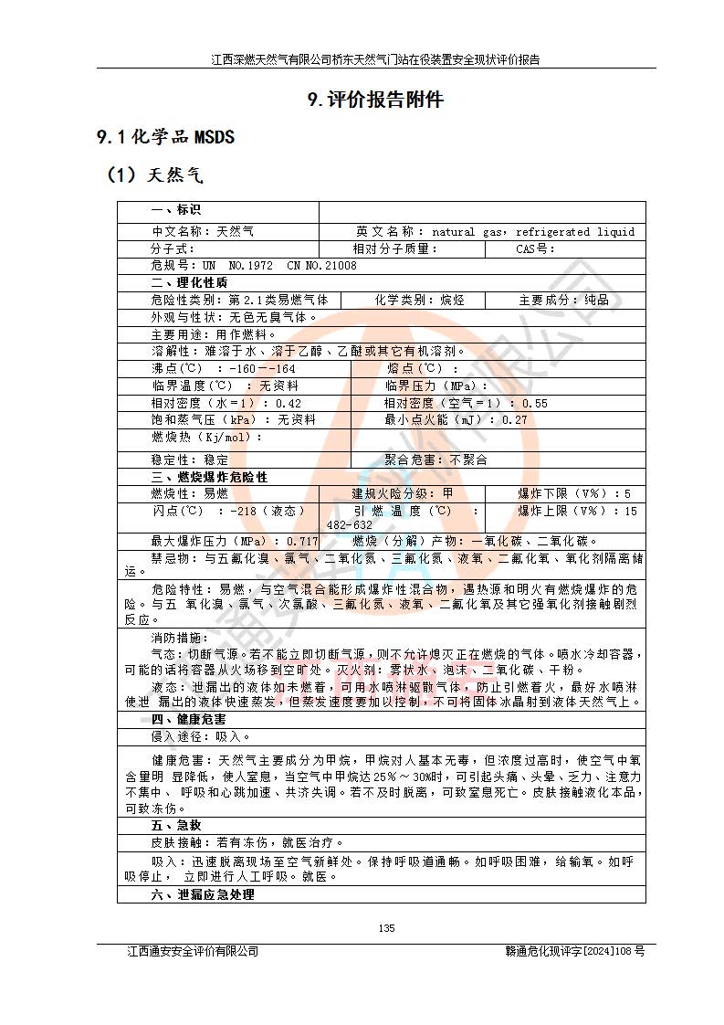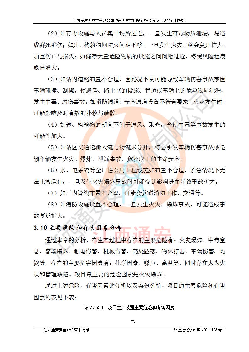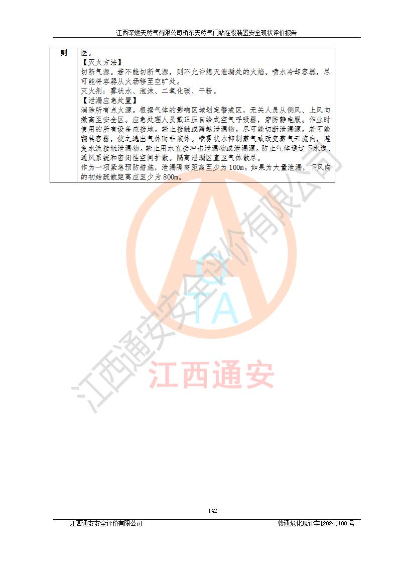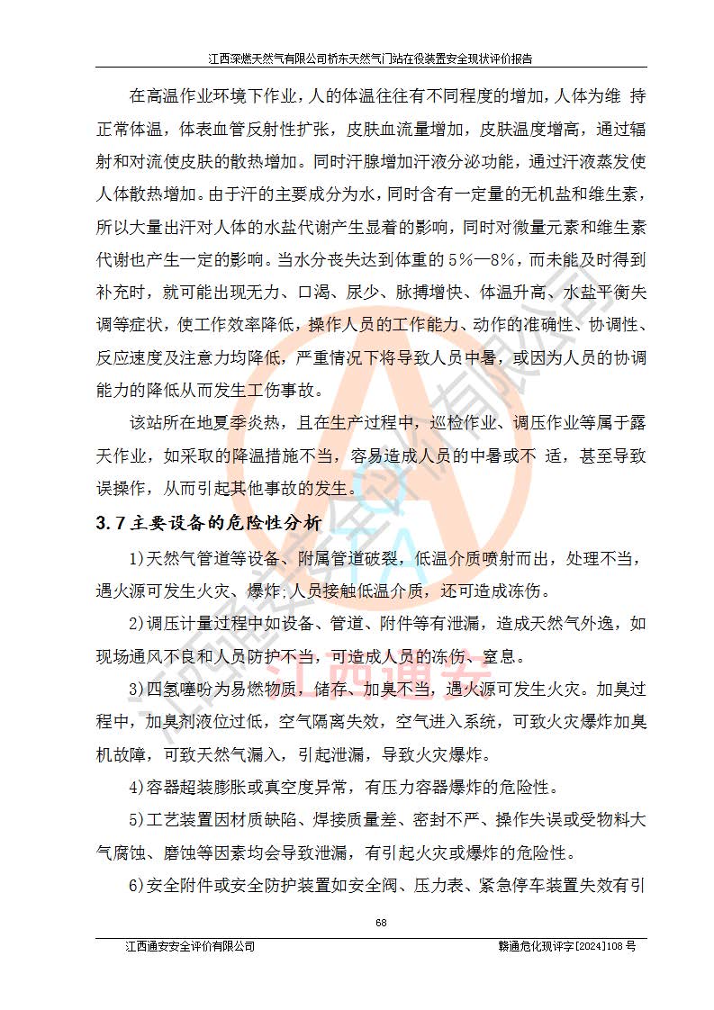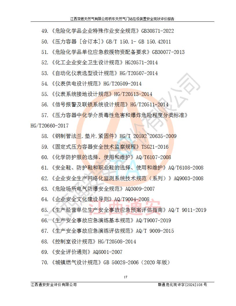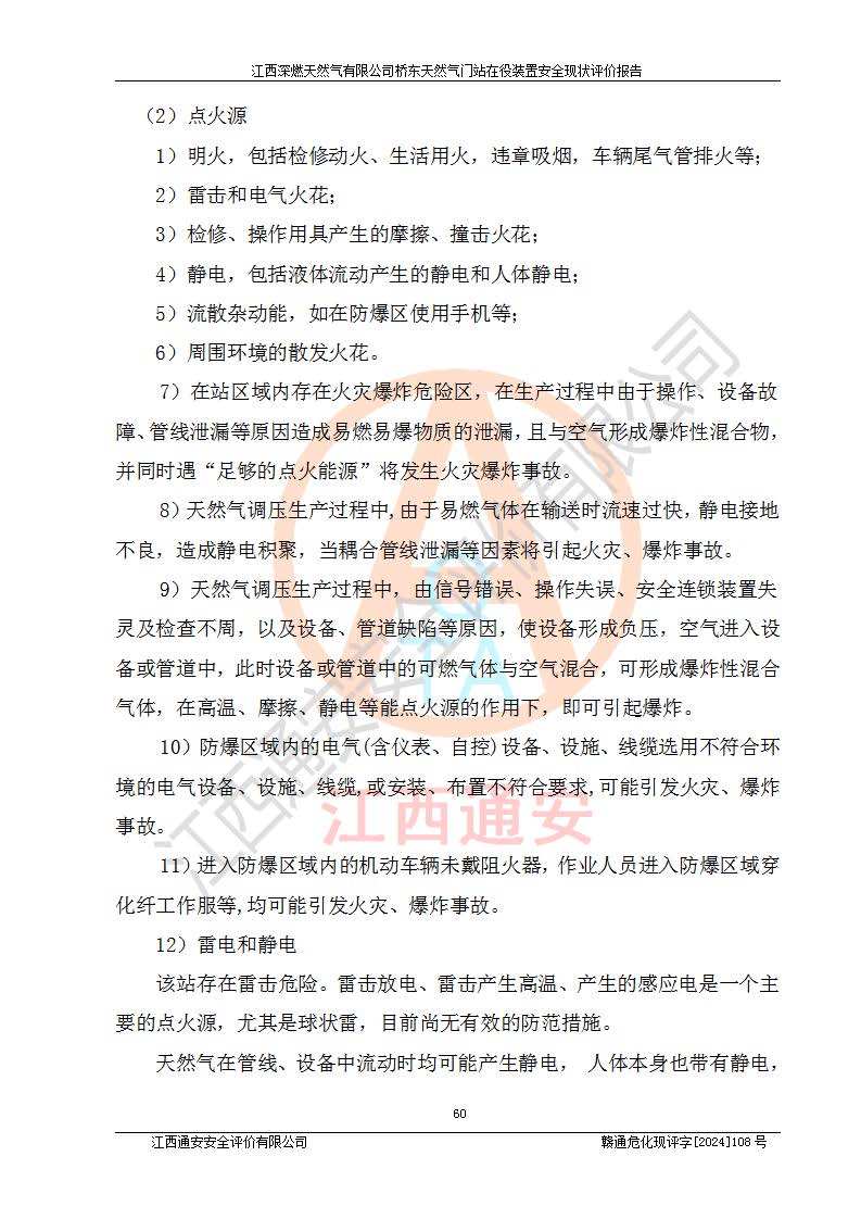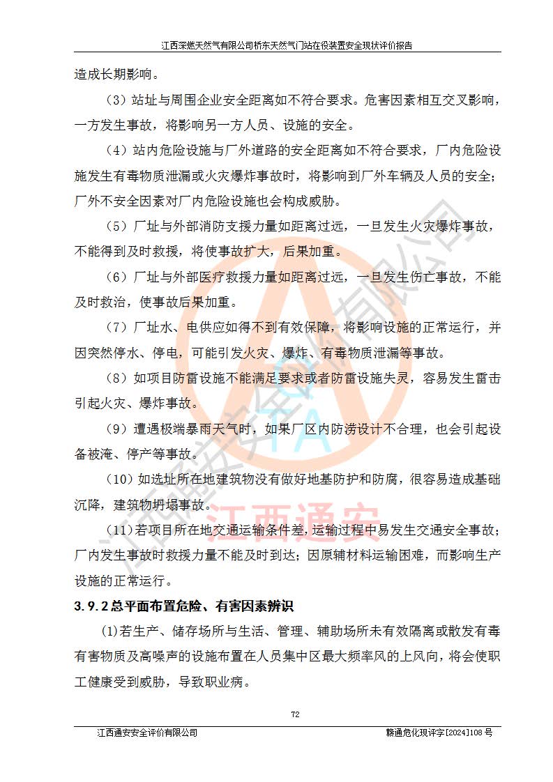 其它 | 1、依據(jù)相關(guān)法律、法規(guī)、標(biāo)準(zhǔn)等的規(guī)定,該項(xiàng)目周邊環(huán)境、總平面布置、建筑結(jié)構(gòu)、工藝及設(shè)備、防火防爆安全設(shè)施、有毒有害因素控制等符合**相關(guān)標(biāo)準(zhǔn)規(guī)范的要求,能滿(mǎn)足安全生產(chǎn)的要求。 2、該項(xiàng)目涉及的危險(xiǎn)化學(xué)品有:天然氣、四氫噻吩、柴油,其中天然氣屬于重點(diǎn)監(jiān)管的危險(xiǎn)化學(xué)品,不涉及特別管控危險(xiǎn)化學(xué)品。 3、該項(xiàng)目在生產(chǎn)過(guò)程中存在的主要危險(xiǎn)有:火災(zāi)爆炸、中毒窒息、容器爆炸、觸電傷害、機(jī)械傷害、高處墜落、**傷害、灼燙等。其中火災(zāi)爆炸、中毒窒息、容器爆炸是*主要的危險(xiǎn)因素。 4、該項(xiàng)目生產(chǎn)單元和儲(chǔ)存設(shè)施單元不構(gòu)成危險(xiǎn)化學(xué)品重大危險(xiǎn)源。 5、根據(jù)《**安全監(jiān)管總局關(guān)于公布首批重點(diǎn)監(jiān)管的危險(xiǎn)化工工藝目錄的通知》(安監(jiān)總管三〔2009〕116號(hào))和《**安全監(jiān)管總局關(guān)于公布第二批重點(diǎn)監(jiān)管危險(xiǎn)化工工藝目錄和調(diào)整首批重點(diǎn)監(jiān)管危險(xiǎn)化工工藝中部分典型工藝的通知》(安監(jiān)總管三〔2013〕3號(hào))進(jìn)行危險(xiǎn)工藝辨識(shí):該項(xiàng)目不涉及重點(diǎn)監(jiān)管的危險(xiǎn)化工工藝。 6、作業(yè)條件危險(xiǎn)性分析評(píng)價(jià)結(jié)果:該項(xiàng)目的作業(yè)條件相對(duì)比較安全。在選定的2個(gè)單元中13個(gè)小項(xiàng)目里,可能出現(xiàn)“顯著危險(xiǎn)”有1個(gè)項(xiàng)目,且顯著危險(xiǎn)項(xiàng)目的出現(xiàn)均由物料的危險(xiǎn)程度所決定,而“一般危險(xiǎn)”有8個(gè)項(xiàng)目,其余項(xiàng)目均在“稍有危險(xiǎn)”范圍,作業(yè)條件相對(duì)安全。 7、危險(xiǎn)度評(píng)價(jià)結(jié)果:項(xiàng)目工藝裝置區(qū)場(chǎng)所危險(xiǎn)度屬Ⅱ級(jí),中度危險(xiǎn)級(jí)別。 企業(yè)應(yīng)加強(qiáng)日常管理工作,防范于未然。生產(chǎn)區(qū)域內(nèi)應(yīng)嚴(yán)禁煙火,設(shè)置的泄漏檢測(cè)報(bào)警裝置應(yīng)定期進(jìn)行校驗(yàn)或檢定保障其正常工作。不得私自關(guān)閉設(shè)置的可燃?xì)怏w檢測(cè)報(bào)警系統(tǒng)。并且應(yīng)在各作業(yè)場(chǎng)所為作業(yè)人員配置了勞動(dòng)保護(hù)用品和器具,盡可能降低安全風(fēng)險(xiǎn)。 評(píng)價(jià)結(jié)論:本報(bào)告認(rèn)為,江西深燃天然氣有限公司橋東天然氣門(mén)站現(xiàn)場(chǎng)自動(dòng)化控制系統(tǒng)運(yùn)行正常,自動(dòng)化控制系統(tǒng)運(yùn)行正常,有關(guān)從業(yè)人員資質(zhì)符合《城鎮(zhèn)燃?xì)夤芾項(xiàng)l例》(2010年11月19日中華人民共和國(guó)***令第583號(hào)公布 根據(jù)2016年2月6日《***關(guān)于修改部分行政法規(guī)的決定》修訂)及《江西省燃?xì)夤芾磙k法》(2003年8月31日江西省人民**令**23號(hào)公布 2014年1月30日江西省人民**令第210號(hào)**次修正 2019年11月27日江西省人民**令第242號(hào)第二次修正)要求,安全設(shè)施及安全管理符合**及有關(guān)部門(mén)關(guān)于安全生產(chǎn)法律、法規(guī)、標(biāo)準(zhǔn)的要求,安全風(fēng)險(xiǎn)是可以控制的,其風(fēng)險(xiǎn)程度是可以接受的,安全現(xiàn)狀符合安全生產(chǎn)條件,能夠滿(mǎn)足安全生產(chǎn)的要求。