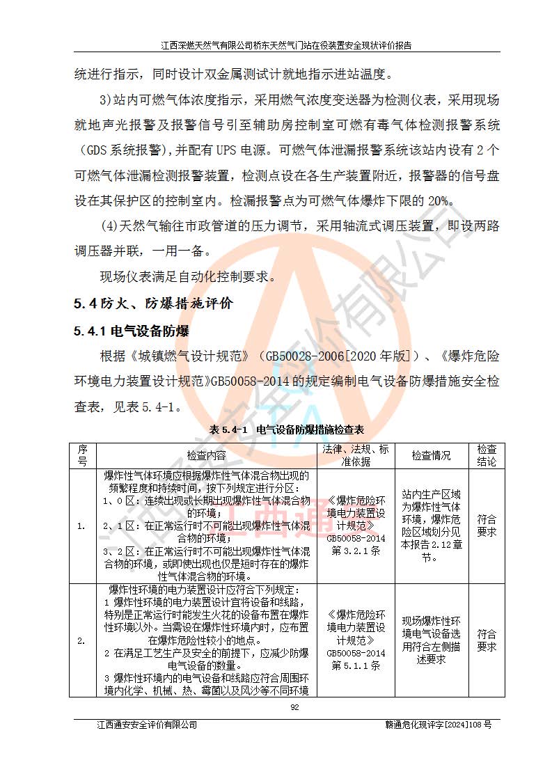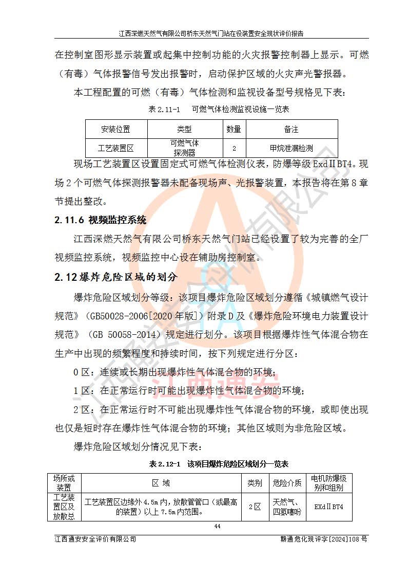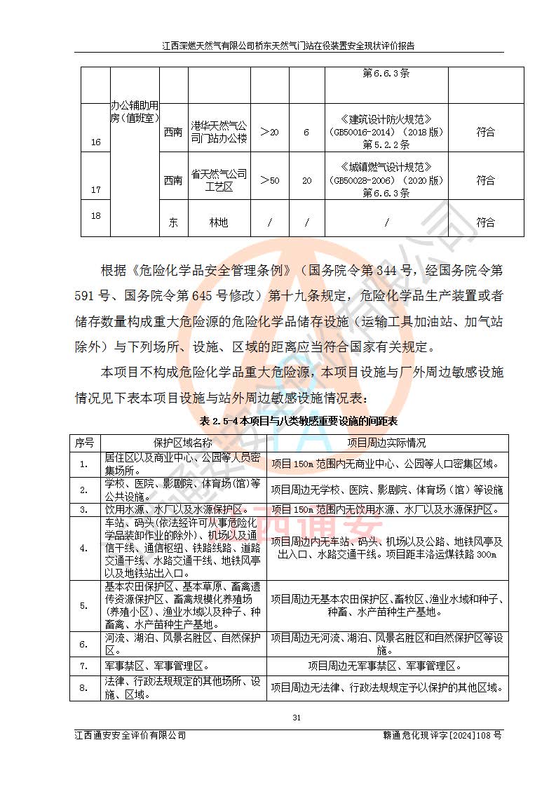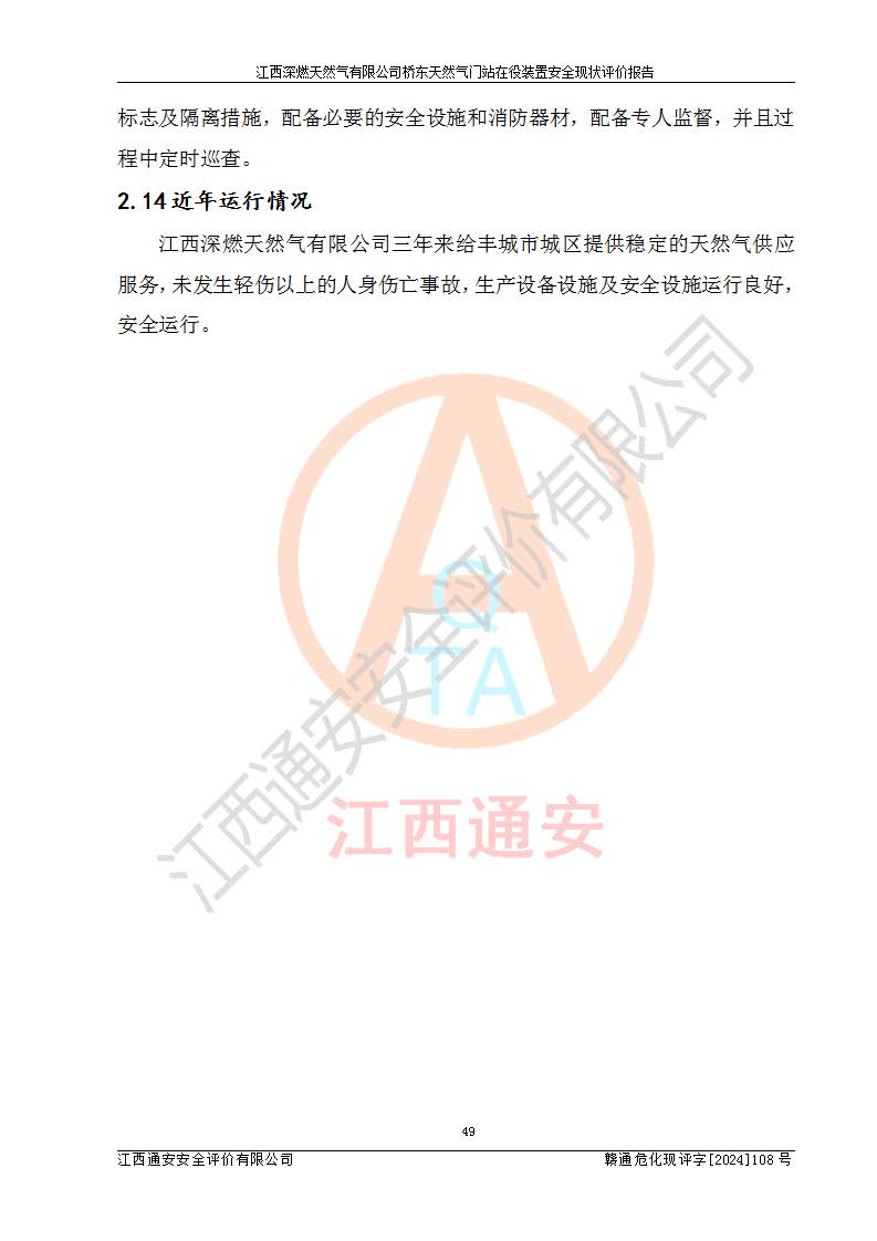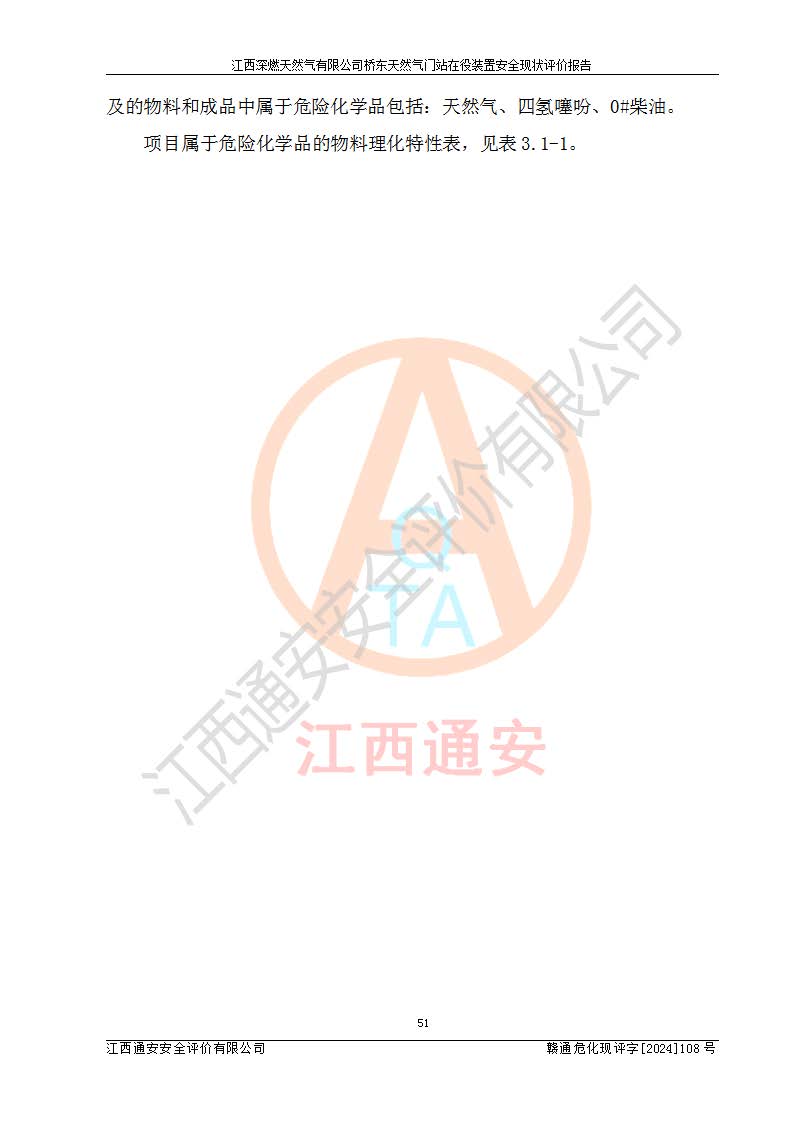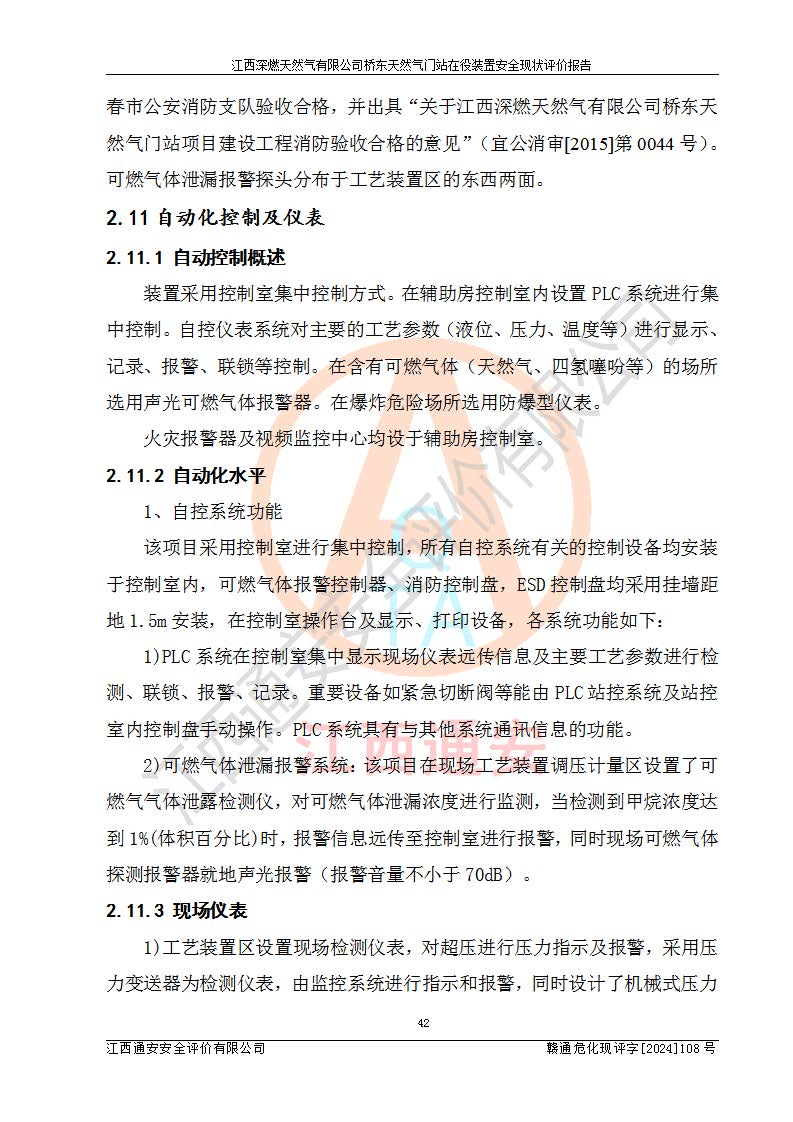 其它 | 1、依據(jù)相關(guān)法律、法規(guī)、標(biāo)準(zhǔn)等的規(guī)定,該項(xiàng)目周邊環(huán)境、總平面布置、建筑結(jié)構(gòu)、工藝及設(shè)備、防火防爆安全設(shè)施、有毒有害因素控制等符合**相關(guān)標(biāo)準(zhǔn)規(guī)范的要求,能滿(mǎn)足安全生產(chǎn)的要求。 2、該項(xiàng)目涉及的危險(xiǎn)化學(xué)品有:天然氣、四氫噻吩、柴油,其中天然氣屬于重點(diǎn)監(jiān)管的危險(xiǎn)化學(xué)品,不涉及特別管控危險(xiǎn)化學(xué)品。 3、該項(xiàng)目在生產(chǎn)過(guò)程中存在的主要危險(xiǎn)有:火災(zāi)爆炸、中毒窒息、容器爆炸、觸電傷害、機(jī)械傷害、高處墜落、**傷害、灼燙等。其中火災(zāi)爆炸、中毒窒息、容器爆炸是*主要的危險(xiǎn)因素。 4、該項(xiàng)目生產(chǎn)單元和儲(chǔ)存設(shè)施單元不構(gòu)成危險(xiǎn)化學(xué)品重大危險(xiǎn)源。 5、根據(jù)《**安全監(jiān)管總局關(guān)于公布首批重點(diǎn)監(jiān)管的危險(xiǎn)化工工藝目錄的通知》(安監(jiān)總管三〔2009〕116號(hào))和《**安全監(jiān)管總局關(guān)于公布第二批重點(diǎn)監(jiān)管危險(xiǎn)化工工藝目錄和調(diào)整首批重點(diǎn)監(jiān)管危險(xiǎn)化工工藝中部分典型工藝的通知》(安監(jiān)總管三〔2013〕3號(hào))進(jìn)行危險(xiǎn)工藝辨識(shí):該項(xiàng)目不涉及重點(diǎn)監(jiān)管的危險(xiǎn)化工工藝。 6、作業(yè)條件危險(xiǎn)性分析評(píng)價(jià)結(jié)果:該項(xiàng)目的作業(yè)條件相對(duì)比較安全。在選定的2個(gè)單元中13個(gè)小項(xiàng)目里,可能出現(xiàn)“顯著危險(xiǎn)”有1個(gè)項(xiàng)目,且顯著危險(xiǎn)項(xiàng)目的出現(xiàn)均由物料的危險(xiǎn)程度所決定,而“一般危險(xiǎn)”有8個(gè)項(xiàng)目,其余項(xiàng)目均在“稍有危險(xiǎn)”范圍,作業(yè)條件相對(duì)安全。 7、危險(xiǎn)度評(píng)價(jià)結(jié)果:項(xiàng)目工藝裝置區(qū)場(chǎng)所危險(xiǎn)度屬Ⅱ級(jí),中度危險(xiǎn)級(jí)別。 企業(yè)應(yīng)加強(qiáng)日常管理工作,防范于未然。生產(chǎn)區(qū)域內(nèi)應(yīng)嚴(yán)禁煙火,設(shè)置的泄漏檢測(cè)報(bào)警裝置應(yīng)定期進(jìn)行校驗(yàn)或檢定保障其正常工作。不得私自關(guān)閉設(shè)置的可燃?xì)怏w檢測(cè)報(bào)警系統(tǒng)。并且應(yīng)在各作業(yè)場(chǎng)所為作業(yè)人員配置了勞動(dòng)保護(hù)用品和器具,盡可能降低安全風(fēng)險(xiǎn)。 評(píng)價(jià)結(jié)論:本報(bào)告認(rèn)為,江西深燃天然氣有限公司橋東天然氣門(mén)站現(xiàn)場(chǎng)自動(dòng)化控制系統(tǒng)運(yùn)行正常,自動(dòng)化控制系統(tǒng)運(yùn)行正常,有關(guān)從業(yè)人員資質(zhì)符合《城鎮(zhèn)燃?xì)夤芾項(xiàng)l例》(2010年11月19日中華人民共和國(guó)***令第583號(hào)公布 根據(jù)2016年2月6日《***關(guān)于修改部分行政法規(guī)的決定》修訂)及《江西省燃?xì)夤芾磙k法》(2003年8月31日江西省人民**令**23號(hào)公布 2014年1月30日江西省人民**令第210號(hào)**次修正 2019年11月27日江西省人民**令第242號(hào)第二次修正)要求,安全設(shè)施及安全管理符合**及有關(guān)部門(mén)關(guān)于安全生產(chǎn)法律、法規(guī)、標(biāo)準(zhǔn)的要求,安全風(fēng)險(xiǎn)是可以控制的,其風(fēng)險(xiǎn)程度是可以接受的,安全現(xiàn)狀符合安全生產(chǎn)條件,能夠滿(mǎn)足安全生產(chǎn)的要求。