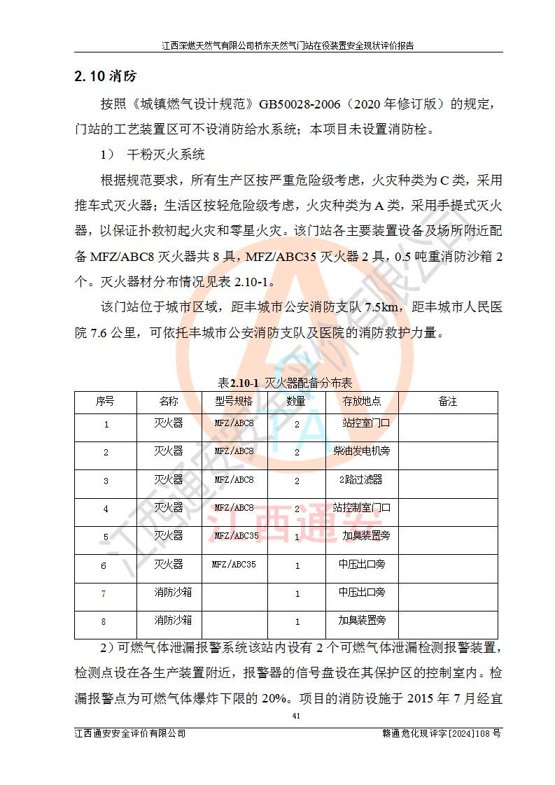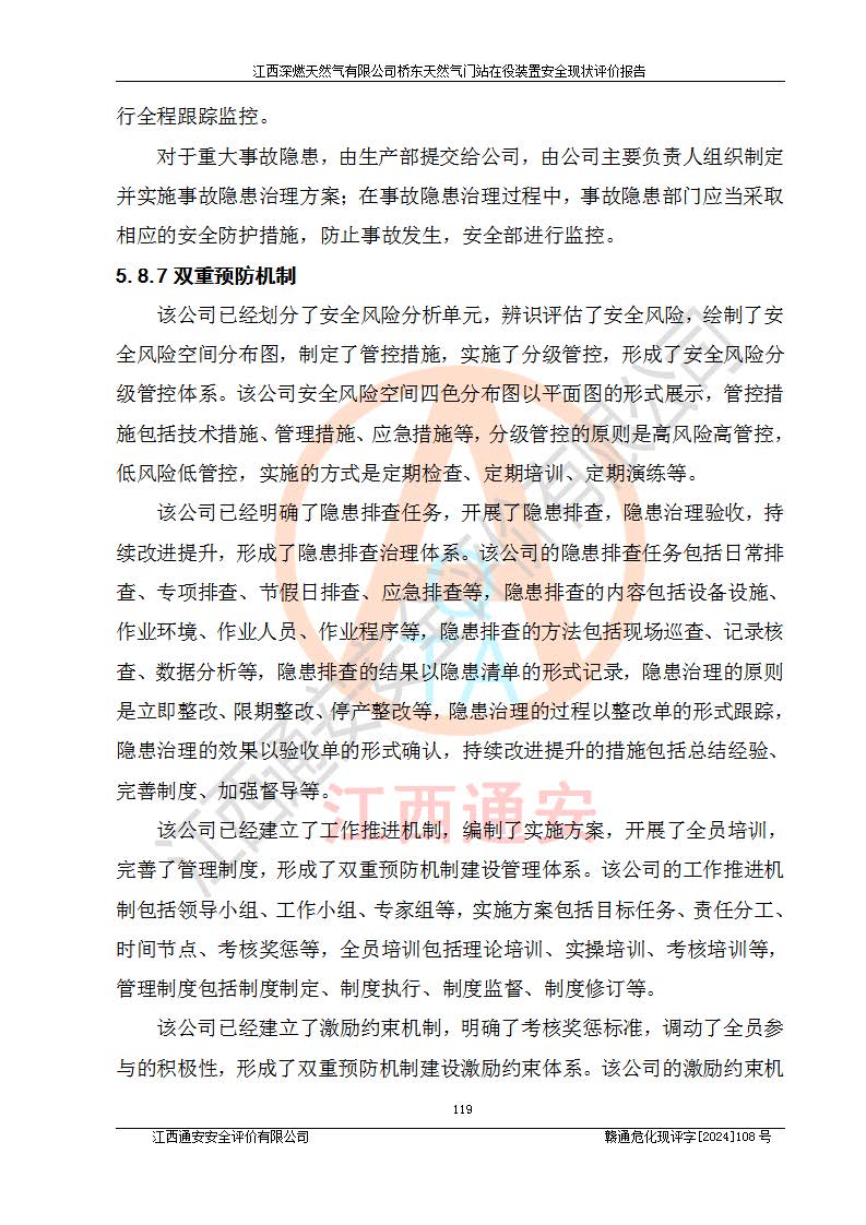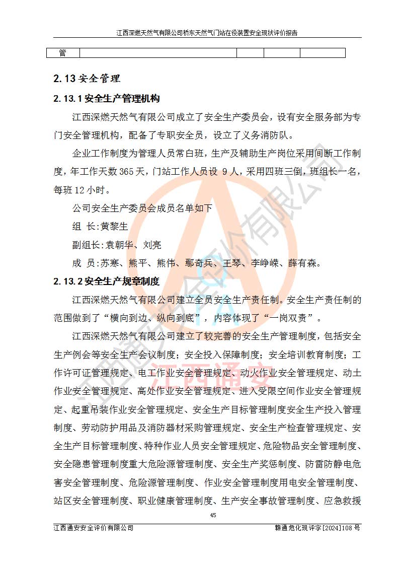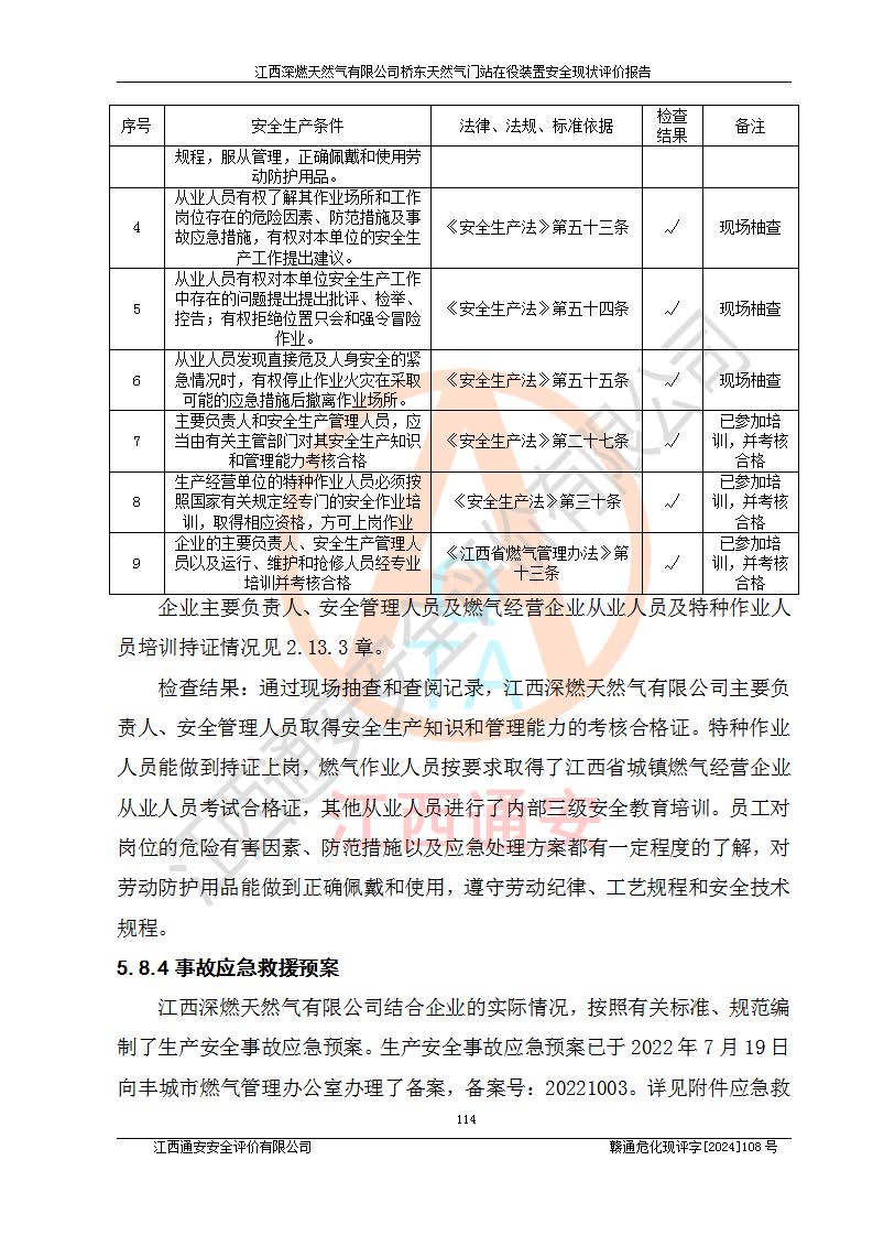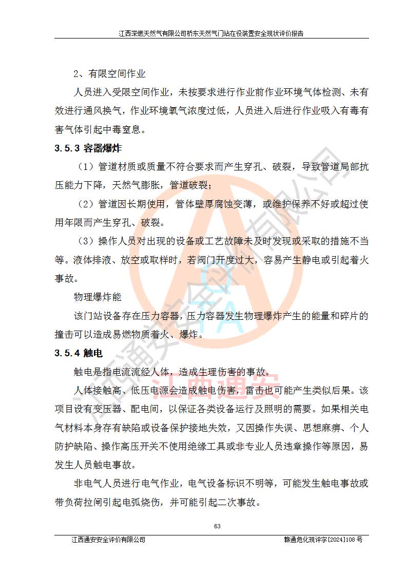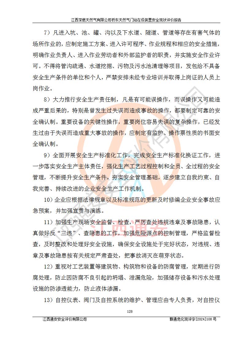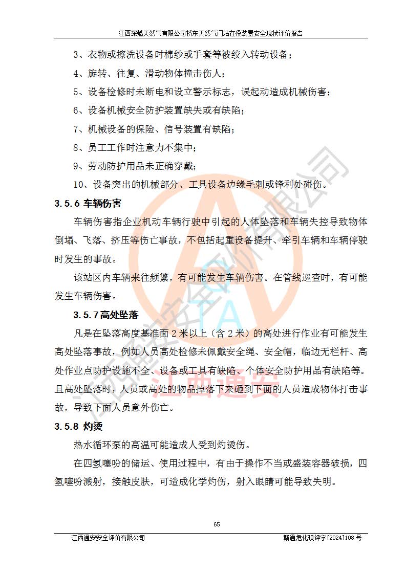其它 | 1、依據(jù)相關(guān)法律、法規(guī)、標(biāo)準(zhǔn)等的規(guī)定,該項(xiàng)目周邊環(huán)境、總平面布置、建筑結(jié)構(gòu)、工藝及設(shè)備、防火防爆安全設(shè)施、有毒有害因素控制等符合**相關(guān)標(biāo)準(zhǔn)規(guī)范的要求,能滿(mǎn)足安全生產(chǎn)的要求。 2、該項(xiàng)目涉及的危險(xiǎn)化學(xué)品有:天然氣、四氫噻吩、柴油,其中天然氣屬于重點(diǎn)監(jiān)管的危險(xiǎn)化學(xué)品,不涉及特別管控危險(xiǎn)化學(xué)品。 3、該項(xiàng)目在生產(chǎn)過(guò)程中存在的主要危險(xiǎn)有:火災(zāi)爆炸、中毒窒息、容器爆炸、觸電傷害、機(jī)械傷害、高處墜落、**傷害、灼燙等。其中火災(zāi)爆炸、中毒窒息、容器爆炸是*主要的危險(xiǎn)因素。 4、該項(xiàng)目生產(chǎn)單元和儲(chǔ)存設(shè)施單元不構(gòu)成危險(xiǎn)化學(xué)品重大危險(xiǎn)源。 5、根據(jù)《**安全監(jiān)管總局關(guān)于公布首批重點(diǎn)監(jiān)管的危險(xiǎn)化工工藝目錄的通知》(安監(jiān)總管三〔2009〕116號(hào))和《**安全監(jiān)管總局關(guān)于公布第二批重點(diǎn)監(jiān)管危險(xiǎn)化工工藝目錄和調(diào)整首批重點(diǎn)監(jiān)管危險(xiǎn)化工工藝中部分典型工藝的通知》(安監(jiān)總管三〔2013〕3號(hào))進(jìn)行危險(xiǎn)工藝辨識(shí):該項(xiàng)目不涉及重點(diǎn)監(jiān)管的危險(xiǎn)化工工藝。 6、作業(yè)條件危險(xiǎn)性分析評(píng)價(jià)結(jié)果:該項(xiàng)目的作業(yè)條件相對(duì)比較安全。在選定的2個(gè)單元中13個(gè)小項(xiàng)目里,可能出現(xiàn)“顯著危險(xiǎn)”有1個(gè)項(xiàng)目,且顯著危險(xiǎn)項(xiàng)目的出現(xiàn)均由物料的危險(xiǎn)程度所決定,而“一般危險(xiǎn)”有8個(gè)項(xiàng)目,其余項(xiàng)目均在“稍有危險(xiǎn)”范圍,作業(yè)條件相對(duì)安全。 7、危險(xiǎn)度評(píng)價(jià)結(jié)果:項(xiàng)目工藝裝置區(qū)場(chǎng)所危險(xiǎn)度屬Ⅱ級(jí),中度危險(xiǎn)級(jí)別。 企業(yè)應(yīng)加強(qiáng)日常管理工作,防范于未然。生產(chǎn)區(qū)域內(nèi)應(yīng)嚴(yán)禁煙火,設(shè)置的泄漏檢測(cè)報(bào)警裝置應(yīng)定期進(jìn)行校驗(yàn)或檢定保障其正常工作。不得私自關(guān)閉設(shè)置的可燃?xì)怏w檢測(cè)報(bào)警系統(tǒng)。并且應(yīng)在各作業(yè)場(chǎng)所為作業(yè)人員配置了勞動(dòng)保護(hù)用品和器具,盡可能降低安全風(fēng)險(xiǎn)。 評(píng)價(jià)結(jié)論:本報(bào)告認(rèn)為,江西深燃天然氣有限公司橋東天然氣門(mén)站現(xiàn)場(chǎng)自動(dòng)化控制系統(tǒng)運(yùn)行正常,自動(dòng)化控制系統(tǒng)運(yùn)行正常,有關(guān)從業(yè)人員資質(zhì)符合《城鎮(zhèn)燃?xì)夤芾項(xiàng)l例》(2010年11月19日中華人民共和國(guó)***令第583號(hào)公布 根據(jù)2016年2月6日《***關(guān)于修改部分行政法規(guī)的決定》修訂)及《江西省燃?xì)夤芾磙k法》(2003年8月31日江西省人民**令**23號(hào)公布 2014年1月30日江西省人民**令第210號(hào)**次修正 2019年11月27日江西省人民**令第242號(hào)第二次修正)要求,安全設(shè)施及安全管理符合**及有關(guān)部門(mén)關(guān)于安全生產(chǎn)法律、法規(guī)、標(biāo)準(zhǔn)的要求,安全風(fēng)險(xiǎn)是可以控制的,其風(fēng)險(xiǎn)程度是可以接受的,安全現(xiàn)狀符合安全生產(chǎn)條件,能夠滿(mǎn)足安全生產(chǎn)的要求。