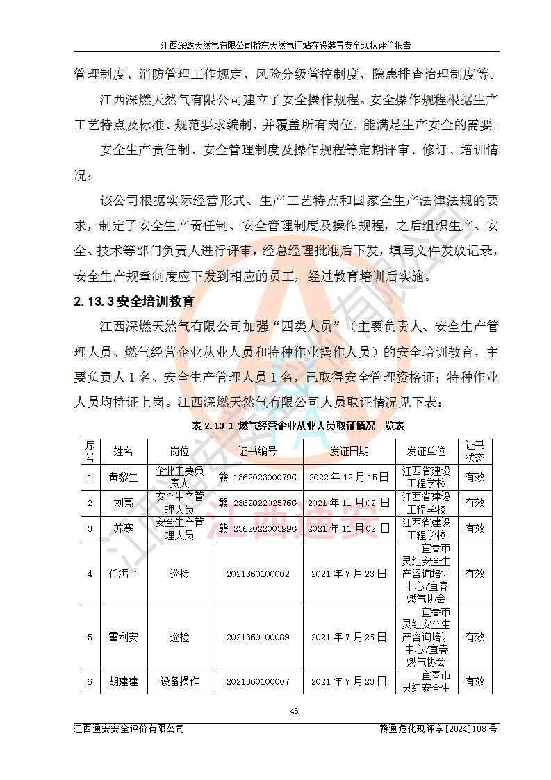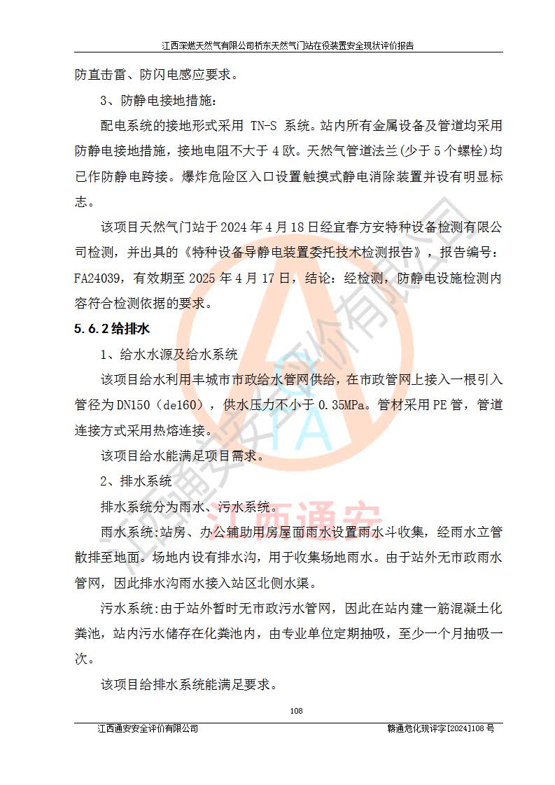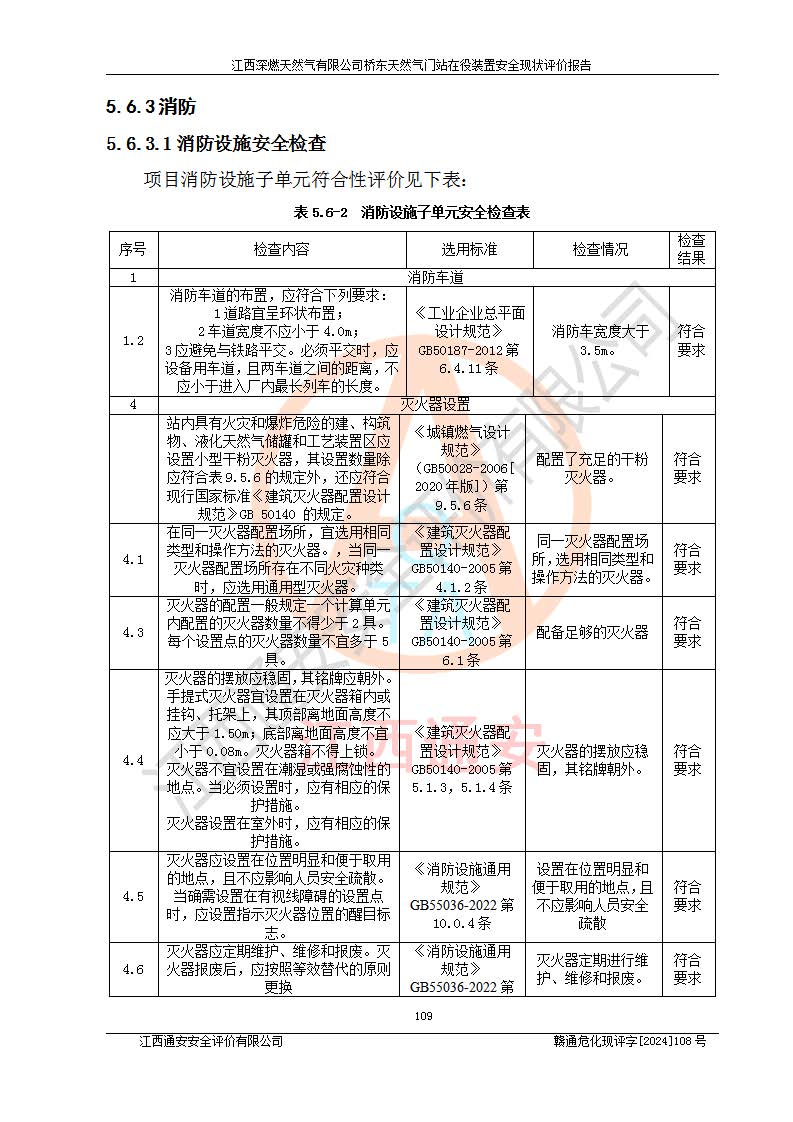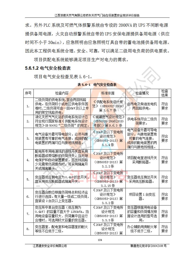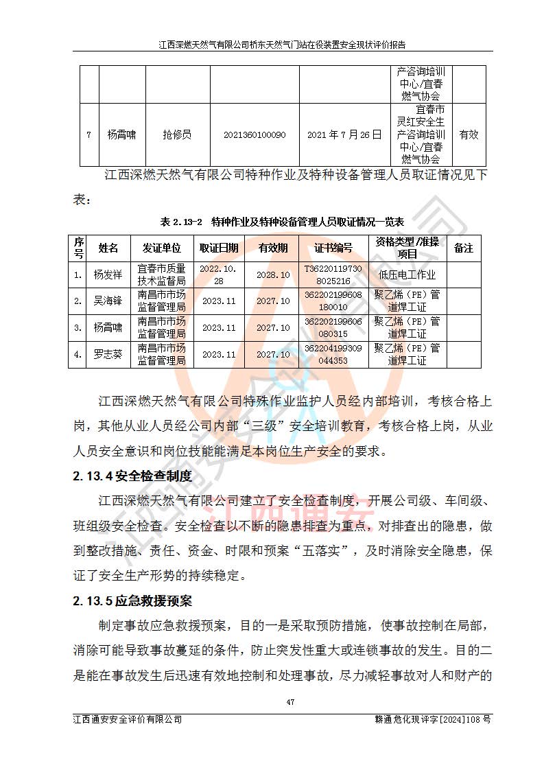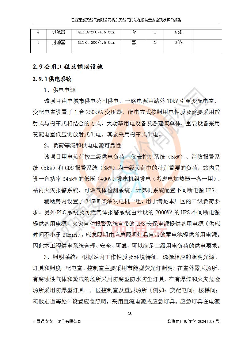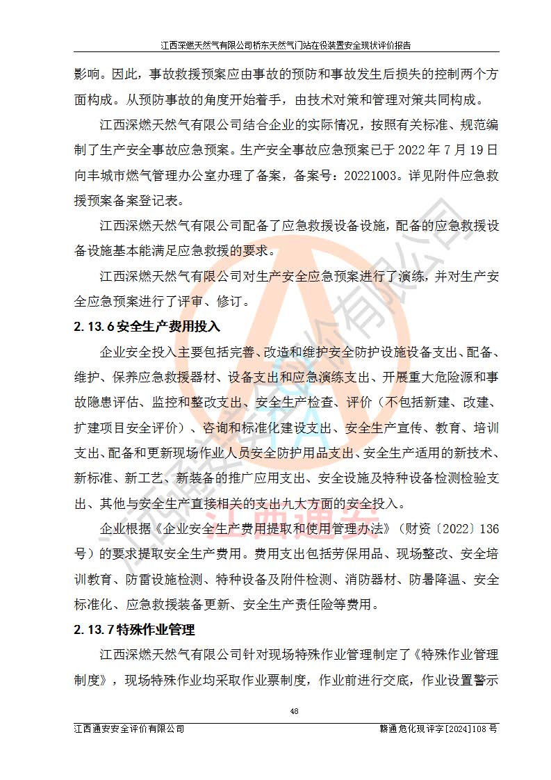 其它 | 1、依據(jù)相關(guān)法律、法規(guī)、標(biāo)準(zhǔn)等的規(guī)定,該項(xiàng)目周邊環(huán)境、總平面布置、建筑結(jié)構(gòu)、工藝及設(shè)備、防火防爆安全設(shè)施、有毒有害因素控制等符合**相關(guān)標(biāo)準(zhǔn)規(guī)范的要求,能滿(mǎn)足安全生產(chǎn)的要求。 2、該項(xiàng)目涉及的危險(xiǎn)化學(xué)品有:天然氣、四氫噻吩、柴油,其中天然氣屬于重點(diǎn)監(jiān)管的危險(xiǎn)化學(xué)品,不涉及特別管控危險(xiǎn)化學(xué)品。 3、該項(xiàng)目在生產(chǎn)過(guò)程中存在的主要危險(xiǎn)有:火災(zāi)爆炸、中毒窒息、容器爆炸、觸電傷害、機(jī)械傷害、高處墜落、**傷害、灼燙等。其中火災(zāi)爆炸、中毒窒息、容器爆炸是*主要的危險(xiǎn)因素。 4、該項(xiàng)目生產(chǎn)單元和儲(chǔ)存設(shè)施單元不構(gòu)成危險(xiǎn)化學(xué)品重大危險(xiǎn)源。 5、根據(jù)《**安全監(jiān)管總局關(guān)于公布首批重點(diǎn)監(jiān)管的危險(xiǎn)化工工藝目錄的通知》(安監(jiān)總管三〔2009〕116號(hào))和《**安全監(jiān)管總局關(guān)于公布第二批重點(diǎn)監(jiān)管危險(xiǎn)化工工藝目錄和調(diào)整首批重點(diǎn)監(jiān)管危險(xiǎn)化工工藝中部分典型工藝的通知》(安監(jiān)總管三〔2013〕3號(hào))進(jìn)行危險(xiǎn)工藝辨識(shí):該項(xiàng)目不涉及重點(diǎn)監(jiān)管的危險(xiǎn)化工工藝。 6、作業(yè)條件危險(xiǎn)性分析評(píng)價(jià)結(jié)果:該項(xiàng)目的作業(yè)條件相對(duì)比較安全。在選定的2個(gè)單元中13個(gè)小項(xiàng)目里,可能出現(xiàn)“顯著危險(xiǎn)”有1個(gè)項(xiàng)目,且顯著危險(xiǎn)項(xiàng)目的出現(xiàn)均由物料的危險(xiǎn)程度所決定,而“一般危險(xiǎn)”有8個(gè)項(xiàng)目,其余項(xiàng)目均在“稍有危險(xiǎn)”范圍,作業(yè)條件相對(duì)安全。 7、危險(xiǎn)度評(píng)價(jià)結(jié)果:項(xiàng)目工藝裝置區(qū)場(chǎng)所危險(xiǎn)度屬Ⅱ級(jí),中度危險(xiǎn)級(jí)別。 企業(yè)應(yīng)加強(qiáng)日常管理工作,防范于未然。生產(chǎn)區(qū)域內(nèi)應(yīng)嚴(yán)禁煙火,設(shè)置的泄漏檢測(cè)報(bào)警裝置應(yīng)定期進(jìn)行校驗(yàn)或檢定保障其正常工作。不得私自關(guān)閉設(shè)置的可燃?xì)怏w檢測(cè)報(bào)警系統(tǒng)。并且應(yīng)在各作業(yè)場(chǎng)所為作業(yè)人員配置了勞動(dòng)保護(hù)用品和器具,盡可能降低安全風(fēng)險(xiǎn)。 評(píng)價(jià)結(jié)論:本報(bào)告認(rèn)為,江西深燃天然氣有限公司橋東天然氣門(mén)站現(xiàn)場(chǎng)自動(dòng)化控制系統(tǒng)運(yùn)行正常,自動(dòng)化控制系統(tǒng)運(yùn)行正常,有關(guān)從業(yè)人員資質(zhì)符合《城鎮(zhèn)燃?xì)夤芾項(xiàng)l例》(2010年11月19日中華人民共和國(guó)***令第583號(hào)公布 根據(jù)2016年2月6日《***關(guān)于修改部分行政法規(guī)的決定》修訂)及《江西省燃?xì)夤芾磙k法》(2003年8月31日江西省人民**令**23號(hào)公布 2014年1月30日江西省人民**令第210號(hào)**次修正 2019年11月27日江西省人民**令第242號(hào)第二次修正)要求,安全設(shè)施及安全管理符合**及有關(guān)部門(mén)關(guān)于安全生產(chǎn)法律、法規(guī)、標(biāo)準(zhǔn)的要求,安全風(fēng)險(xiǎn)是可以控制的,其風(fēng)險(xiǎn)程度是可以接受的,安全現(xiàn)狀符合安全生產(chǎn)條件,能夠滿(mǎn)足安全生產(chǎn)的要求。